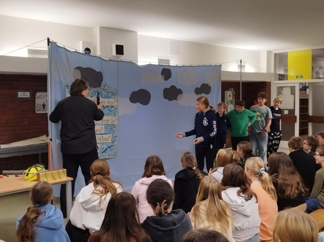Na interaktivním divadelním představení The Alien Grammar Show naši šesťáci a sedmáci sledovali, jak mimozemšťan, kterého pronásleduje tajný agent, zápasí s anglickými časy, předložkami i tvorbou otázek. Naštěstí návštěvníkovi z jiné planety dokázali díky svým znalostem angličtiny snadno a rychle pomoci.